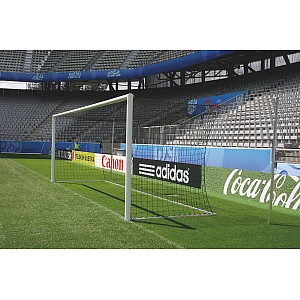 Aluminum soccer goal 7,32 x 2,44 m, fully welded and silver anodized, with free net suspension. According to FIFA-DFB-regulations and DIN-EN 748. Made of especially profiled aluminum profile 100 x 120 mm, with multiple internal stiffening and double groove, in which the net holders are concealed and injury-neutral. The free net suspension, for different net depths, consists of 2 stable tensioning posts in ground sockets, covers and tensioning ropes. The delivery takes place without net and without ground frame, including ground sockets, covers and net holders.