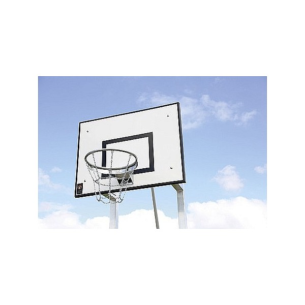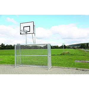 Fully welded. Board size 90 x 120 cm, with basket and welded chain network, 1 m-projection. Door dimensions: 3 x 2 m, m depth. 1 4 welded brackets for mounting. If installed on hard courts the gates for safety with ground anchors or ground sockets (additional price) should be standsicherverschraubt.