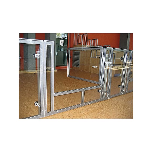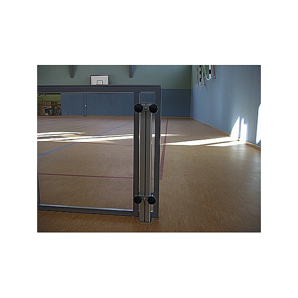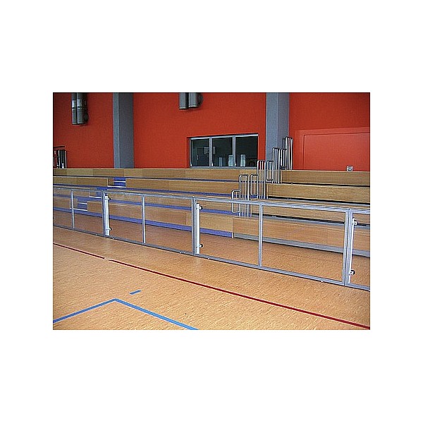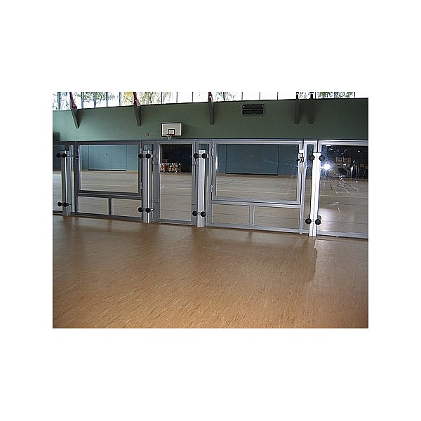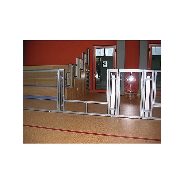BENZ soccer barrier element with steel pipe frame 2488 x 990 mm, colored, painted to RAL. With both sides white-coated front panel made of MDF or transparent polycarbonate sheets. Both versions with white handrail strip.