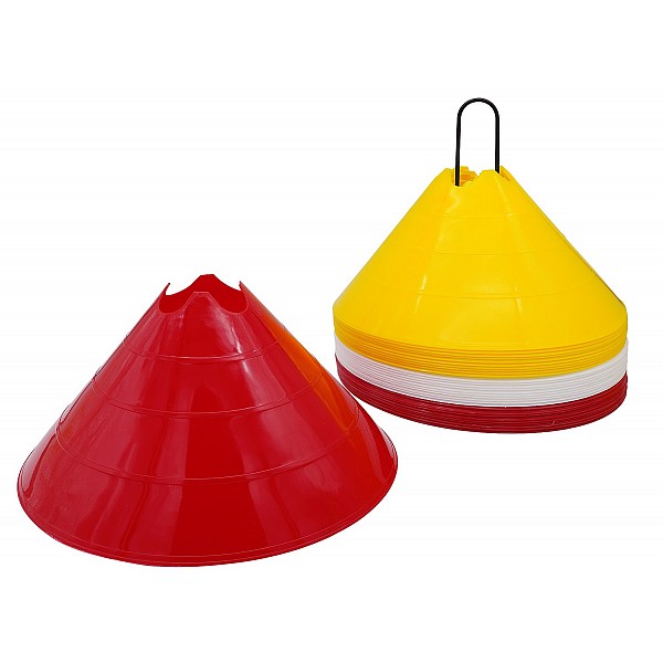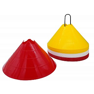 The marking cap set is a practical training aid. It can be used as a substitute for goals during football training or as a slalom helper during ball control training. Simply spread the bonnets on the ground and off you go. The marker bonnets have 4 recesses that can be used as pole holders, so you can build mini hurdles with the help of poles.