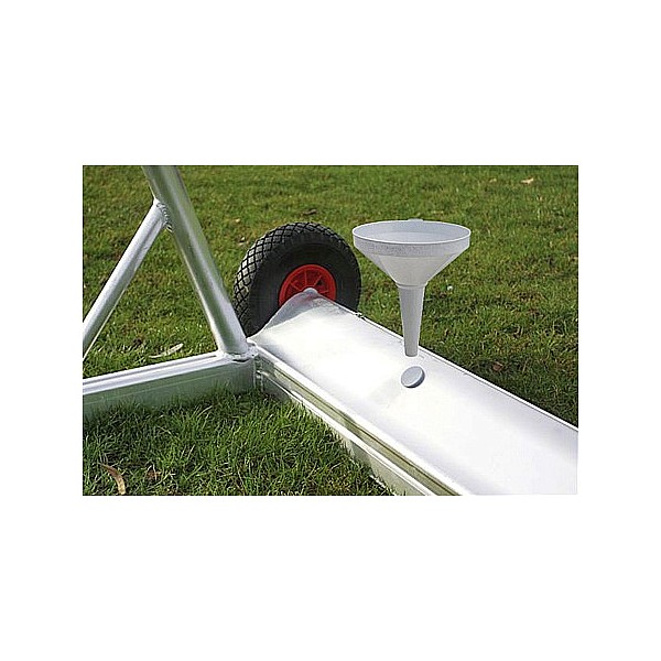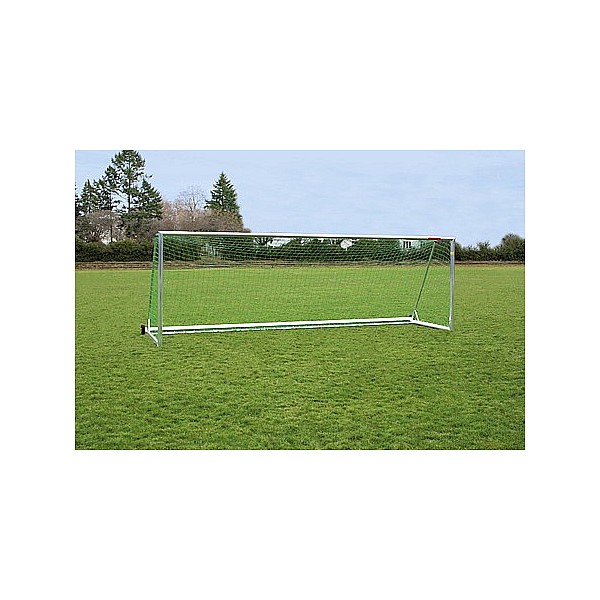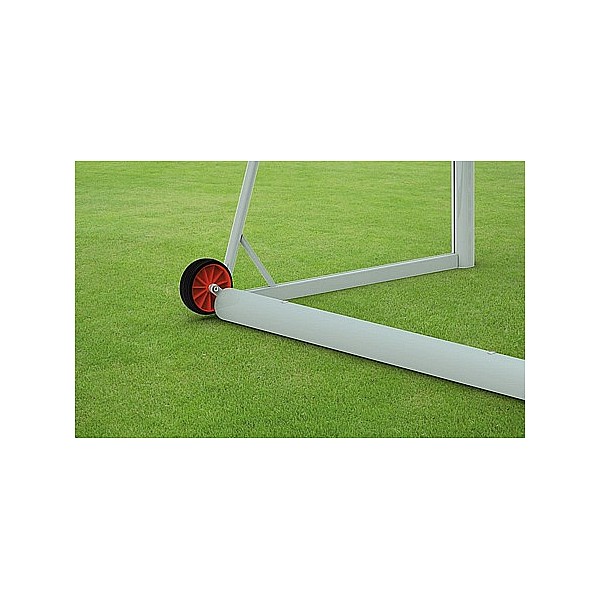 Aluminum Safety soccer goal 7.32 x 2.44 m freestanding, fully welded, lower net depth 2 m. Goalpost from oval profile 120 x 100 mm, particularly torsion by multiple internal profile. Bottom frame 75 x 50 mm. With welded pipe weight and two transport rollers. site to fill with dry quartz sand (100 kg).
