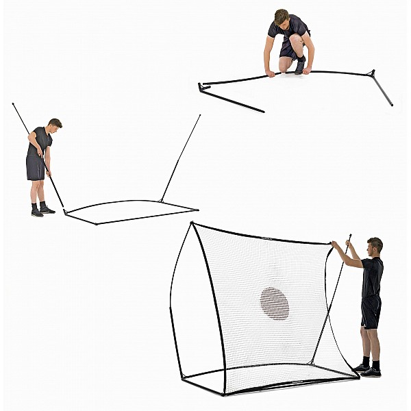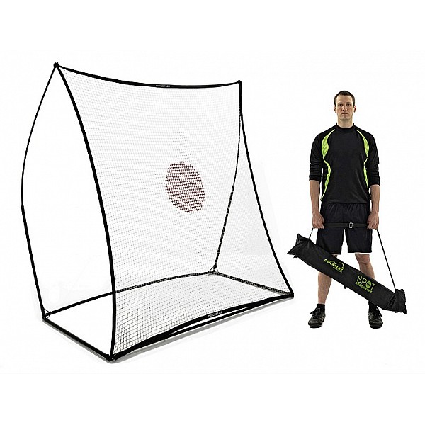 The spot-rebound wall with the dimensions 2.13 x 2.13 m can be used as training equipment for various ball games, such as Football, handball or tennis can be used. If the ball is thrown on the net or shot, it bounces back to different degrees depending on the speed and angle. It can thus train Ball assumptions passing game, volley and many other techniques optimal. A plug-in mechanism makes the structure easily and within 2 minutes is the spot rebound wall ready for use on the field. The durable rods are connected to each other with elastic bands and are easy to press together. With ground anchors the training device is firmly anchored in the ground, so that even strong shots are possible. Disassembled for easy transport and easy to store by the compact dimensions, the wall with the included carrying case. Packet size 119 x 24 x 13.5 cm Weight: 8.8 kg