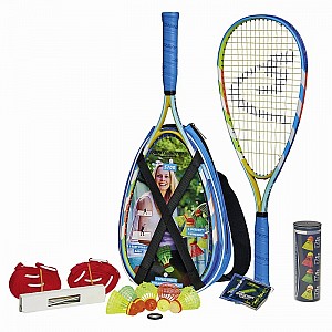 2 Speedrackets S700 of hardened lightweight aluminum with Mega Power Zone in black-blue-white, 5 Mixtube Speeder (1 per FUN, 1 CROSS and NIGHT Speeder, and 2 MATCH Speeder) and a wind ring, including Easy Court Basic 4 Speedlights - for speeden in the dark. Delivered in a black-blue X-Pack bag with reinforced shoulder strap and user manual.