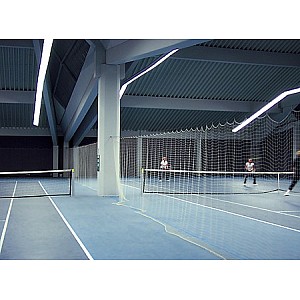 For tennis halls - from about 2.3 mm polypropylene, mesh width 4.5 x 4.5 cm, size 40 x 2.5 m. 38 m long and 4 mm thick steel wire rope, on both sides of the turnbuckle. Bleibeschwerung 200 g / m. 3 attached carabiner per meter on the network. Other sizes on request.