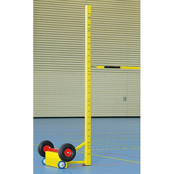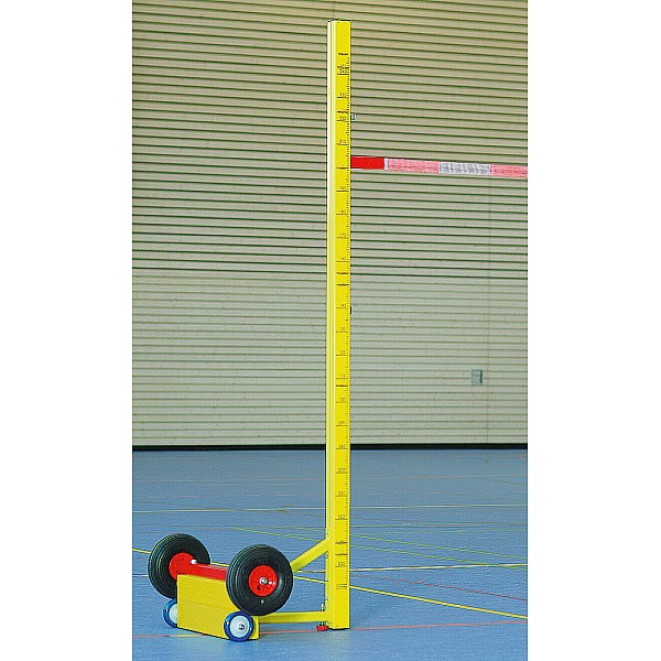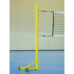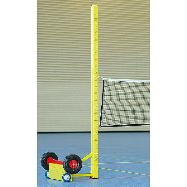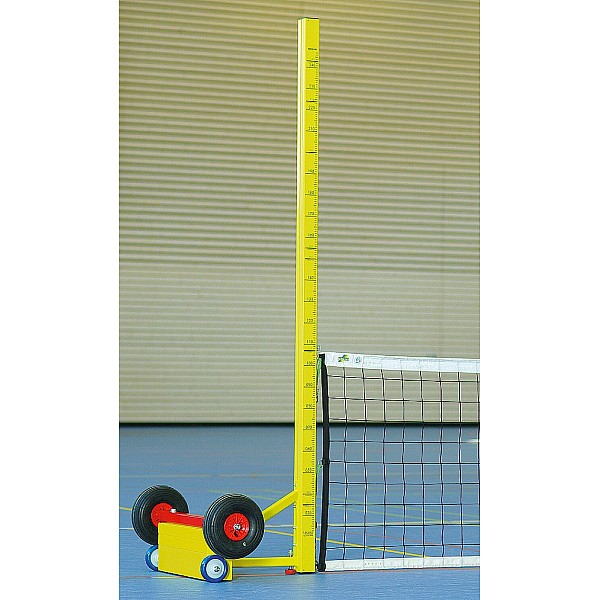 Mobile, free-standing, ground sleeve-independent multi-game system with which, by the power height adjustment, all power games are possible! Post from square aluminum special profile, for indoor and outdoor. Beschwerungskonstruktion from stable steel structure with large, standard castors. Extremely stable due to increased weight of 88 kg (with optional additional weights expandable). Height adjustment of 3-250 cm by means of a special valve. Affixed measuring scale with markings for: Prellball, 2 / 4p (35/40 cm). Tennis (107 cm). Tenniquoits (150 cm). Badminton (155 cm). Fistball (200 cm). Women volleyball (224 cm). Volleyball Men (243 cm).