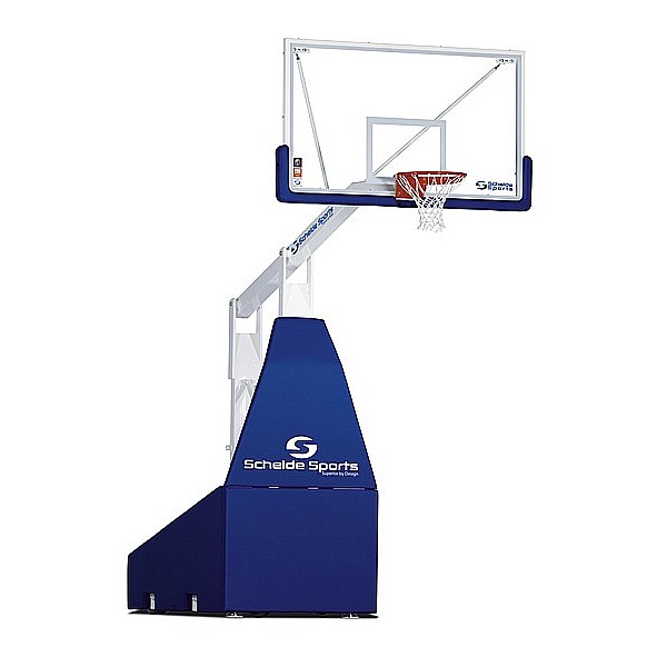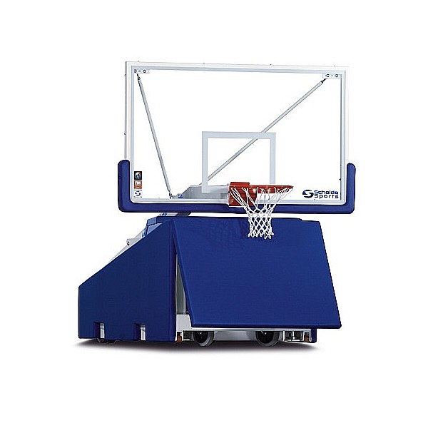 (FIBA LEVEL 3). Projection 165 cm. With glass target board, 105 x 180 cm, in the metal frame with blue upholstery. 6 wheels, 2x front, 4x rear, Ø 200 mm. Lockable mechanism in the rest position. Complete blue upholstery of the base frame. Improved security systems for a quiet game position.