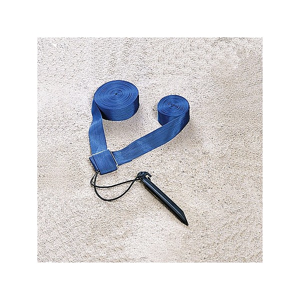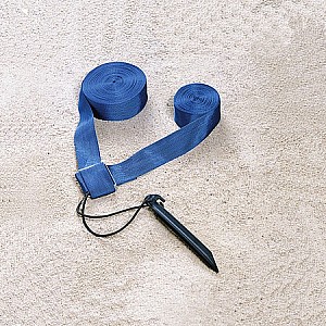 9 x 18 m, adjustable to 8 x 16 m, dark blue. With adjustable plastic corner pieces, 50 mm wide PES webbing and central marking. Incl. 4 plastic anchors (23 cm long) and bungee tension lines.