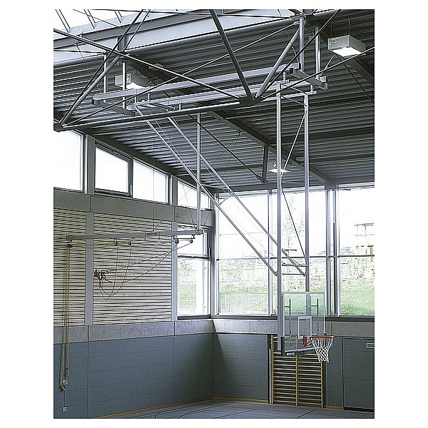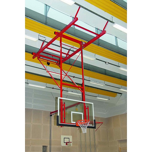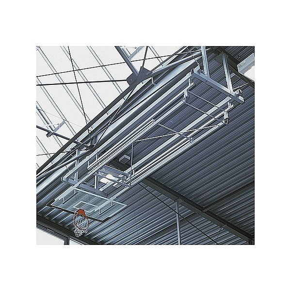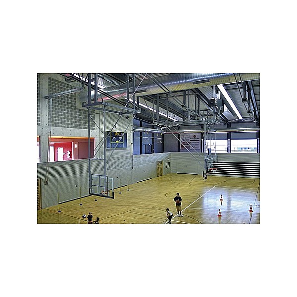For main and cross the field, according to. pulled up with an electric motor to the ceiling. Steel frame in hinged storage. Height of 6.88 m to 7.38 m. No engine, stem, backboard, basket, net and tie replacement.