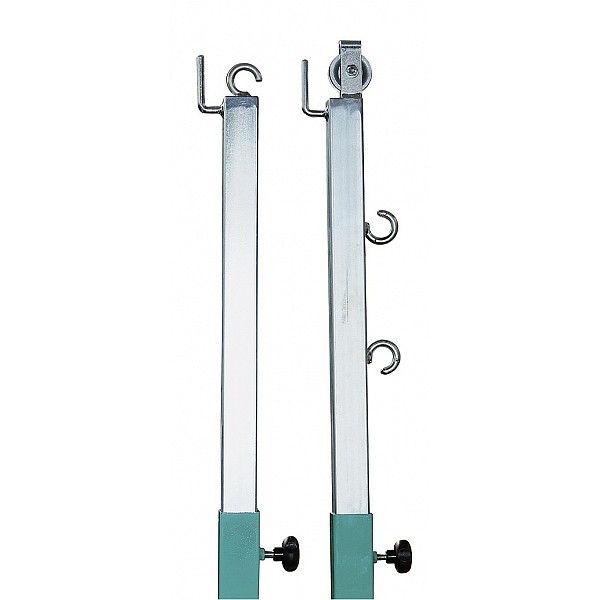 2 square tubes each 40 x 40 mm, for indoor and outdoor, telescopically adjustable by regions game order of the German Federal Turner. Prepared for linen and mesh tape. Without ground sockets.