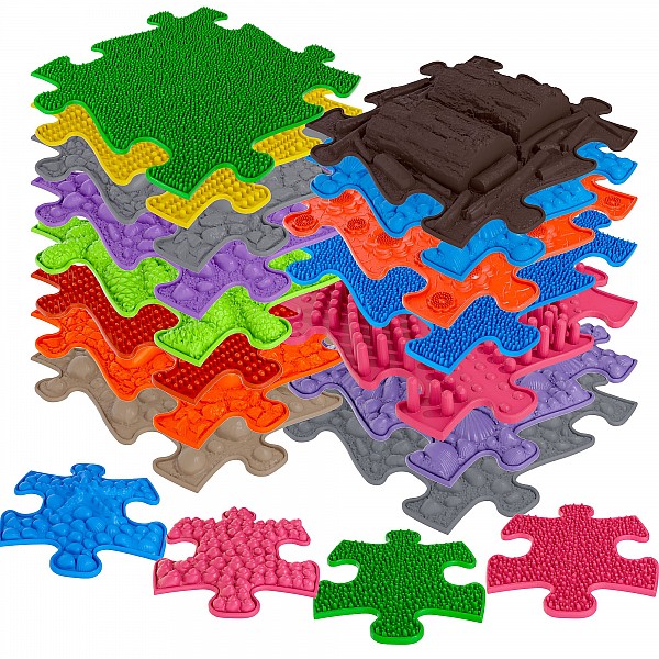 The sensory mats from Muffik offer children a playful walking experience to train their sense of balance, fine motor skills and tactile perception. The alternation between soft and hard surfaces of the mats is also ideal in physiotherapy for tactile stimulation of the feet and foot reflex zones. The individual mats can be put together like a puzzle. Dimensions of the individual elements 28.4 x 28.4 cm and mini pieces: 14.3 x 17.3 cm.