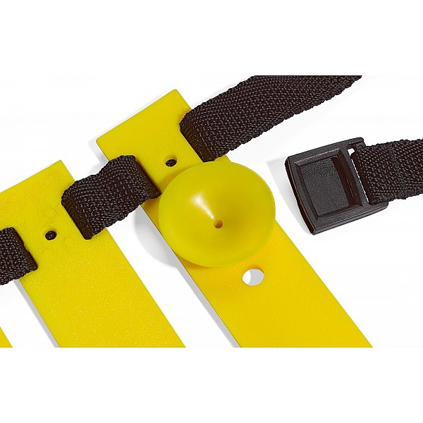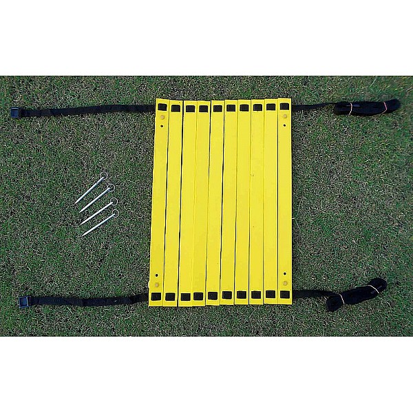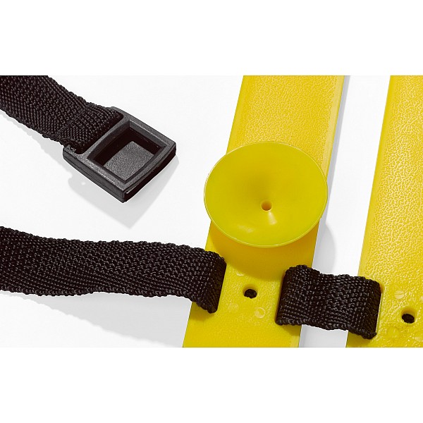 Versatile training aid made of weatherproof plastic, 57 cm wide. Sliding sprouts. For coordination, running and sprint exercises. Quick off and rolled up. Supplied with 4 x pegs for outdoor use and integrated suction cups for indoor use.